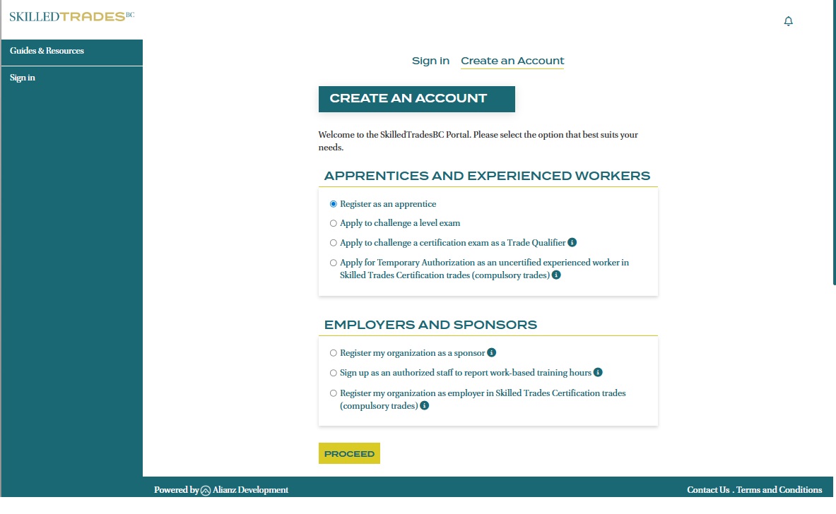- Select the option “Register as an apprentice/ foundation program student” and click “Proceed” button to continue.