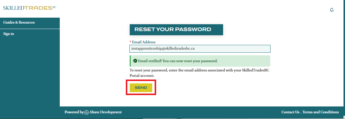 - Enter the email address you used to sign up for a SkilledTradesBC Portal account and click “Send”.