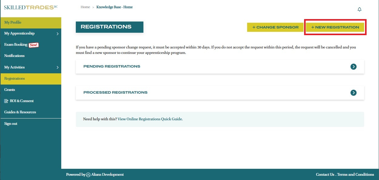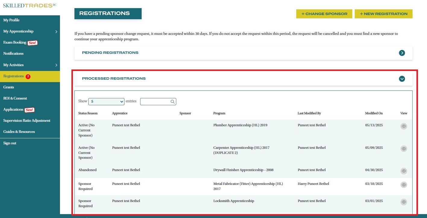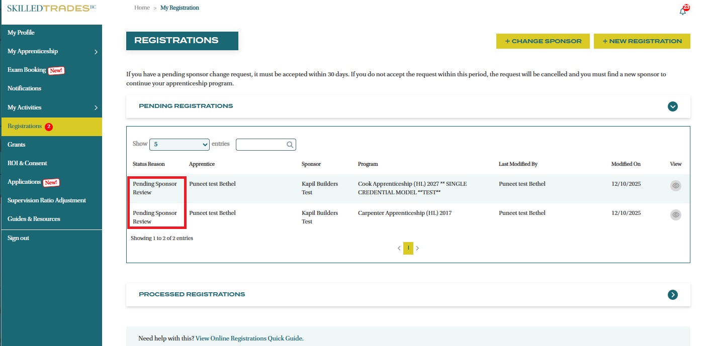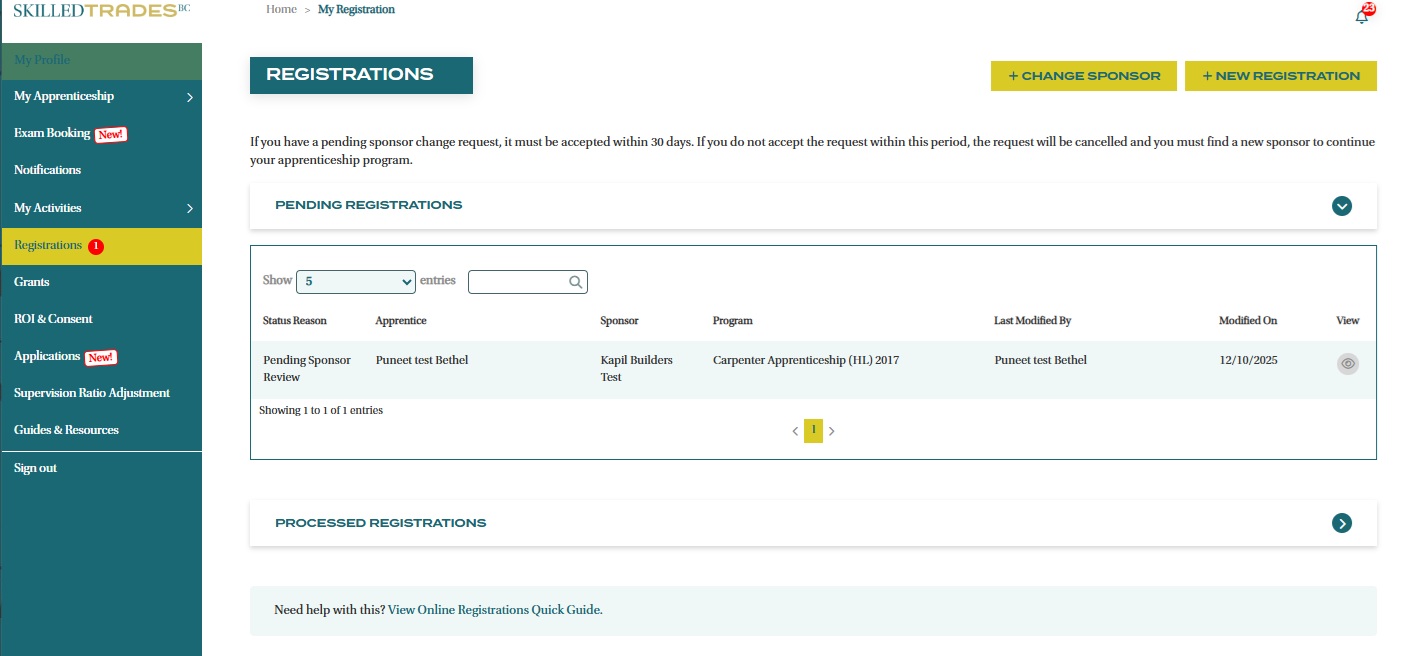 - The registration request(s) can be viewed under Processed Online Registration once SkilledTradesBC has reviewed and approved them.