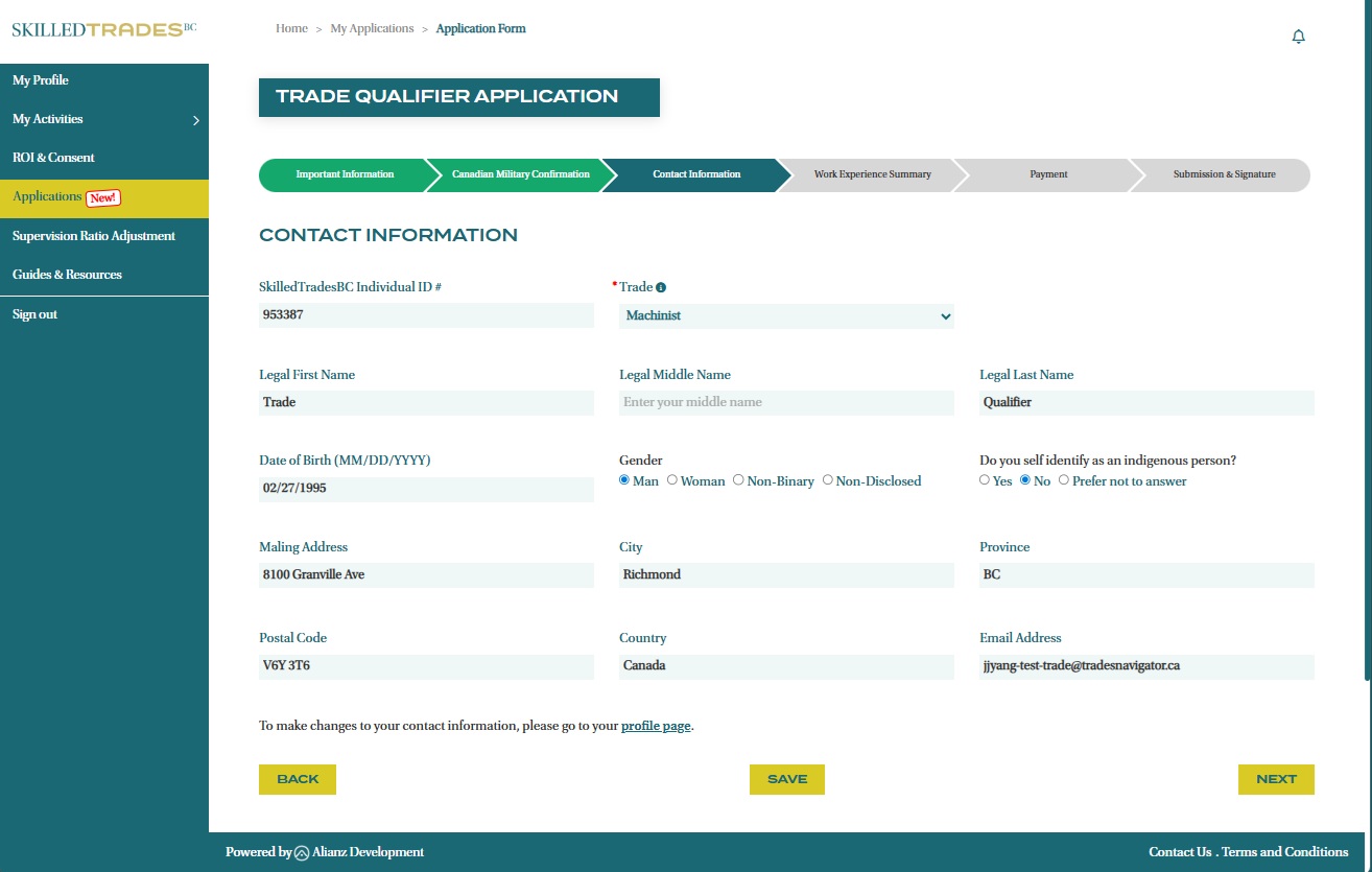- After logging in, click on “Applications” section from the left navigation menu. Click the “Trade Qualifier” button to start your application.
