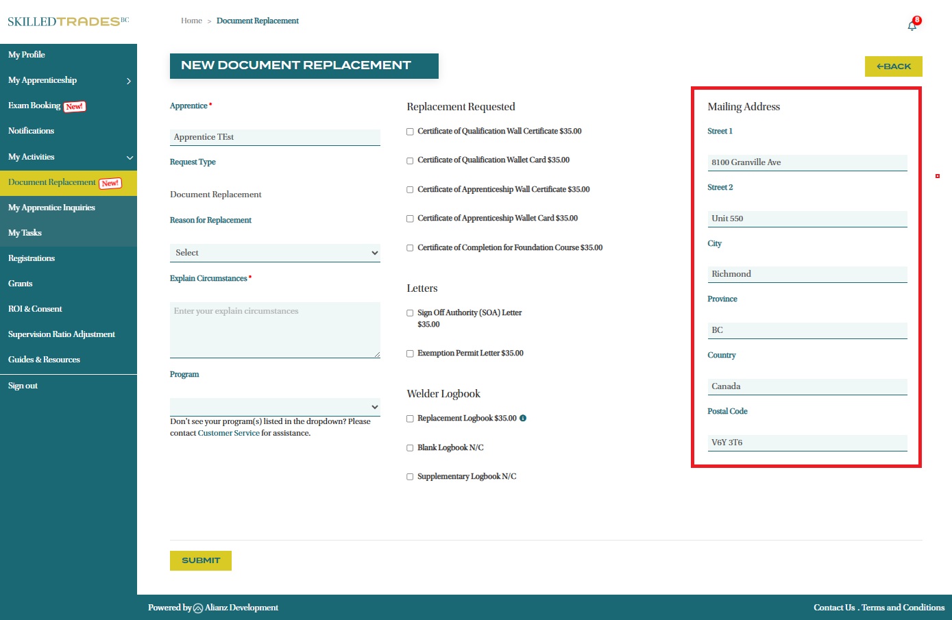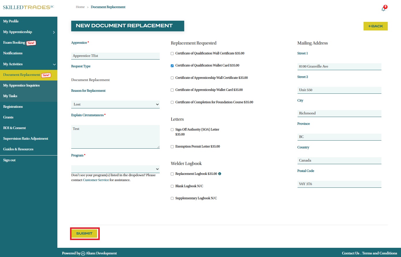 - Review the details you've entered and click on the Submit button to proceed with your request.