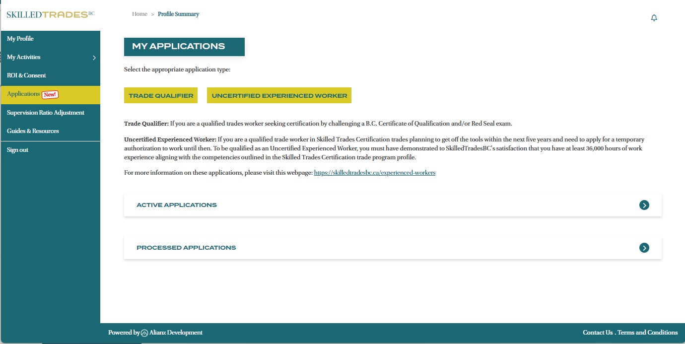 In this section, begin your online application as a Trade Qualifier or Uncertified Experienced Worker. You can also view any active applications you have submitted or drafted as well as applications that have been processed by SkilledTradesBC.